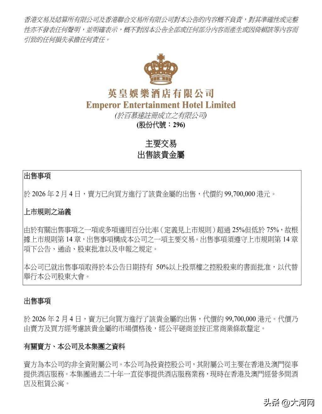 2月4日晚间,英皇娱乐酒店发布公告称,于当日公司的非全资附属公司Right Achieve Limited(正成有限公司)已向买方贺利氏金属香港有限公司进行了该贵金属的出售,代价约9970万港元,而被出售的贵金属为合计重达79公斤的多块金砖。
